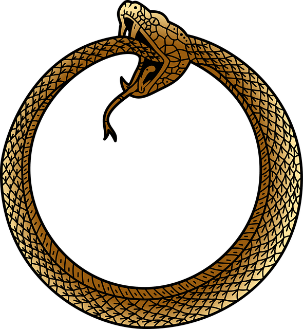 Ouroboros vient du grec « oura » queue et « boros » manger. On le figure par un serpent qui se mord la queue.